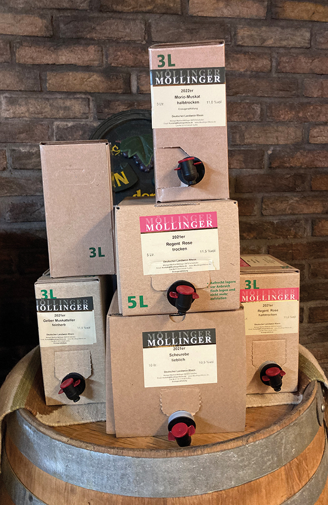 In Schweden ist die Bag-in-Box schon weitgehend bekannt: Mehr als 50 Prozent aller deutschen Weine, die dort verkauft werden, sind in der neuen Verpackung abgefüllt. In Deutschland selbst geschieht die Abfüllung jedoch in den meisten Fällen noch immer in Glasflaschen. Nicht so jedoch beim Weingut Möllinger: Dieses hat sich Anfang der 1990er-Jahre als eines der ersten Weingüter in Deutschland für die Bag-in-Box entschieden. Zunächst reagierte die Kundschaft verhalten oder lehnte die Variante direkt ab. Nach ersten Versuchen mit Apfelsaftbeuteln schwenkte das Weingut schnell auf spezielle gasdichte Doppelfolienbeutel um – mit Erfolg: Innerhalb von drei Jahren sank der Absatz von Flaschenwein um 50 Prozent. Heute ist nahezu jeder verkaufte Wein in einer Bag-in-Box abgefüllt und bei allen Altersgruppen gleichermaßen beliebt. Besonders die langanhaltende Frische der Weine begeistert die Kunden.