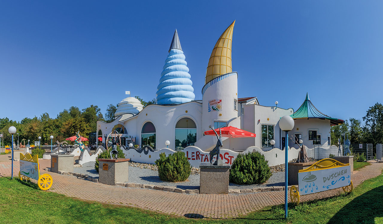 Ende 1997 eröffnet, entstand die laut den Betreibenden „erste und einzige Kunst-Raststätte Deutschlands“ innen wie außen nach den Entwürfen des österreichischen Künstlers und Planers Herbert Maierhofer (1956–2018). Ein bisschen Disneyland, viel Multikulti, ein wenig Kunstmuseum – knallige Farben, Fantasie und geschwungene Formen machen das Design aus. Vor dem Gebäude stehen Skulpturen der zwölf Tierkreiszeichen, im Inneren begegnet den Gästen der „Running Man“ auf seiner Reise durch das Leben in verschiedenen Formen und Farben. Vogelgezwitscher ertönt in den bunt gefliesten sanitären Anlagen.
