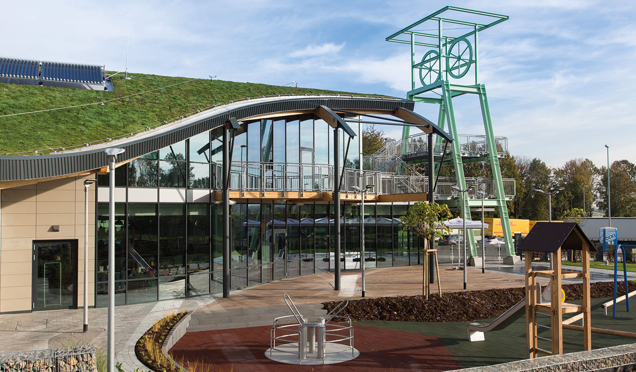 Auf dem geschwungenen Dach des eigentlichen, zweigeschossigen Raststättengebäudes geht es schräg zu – und grün.