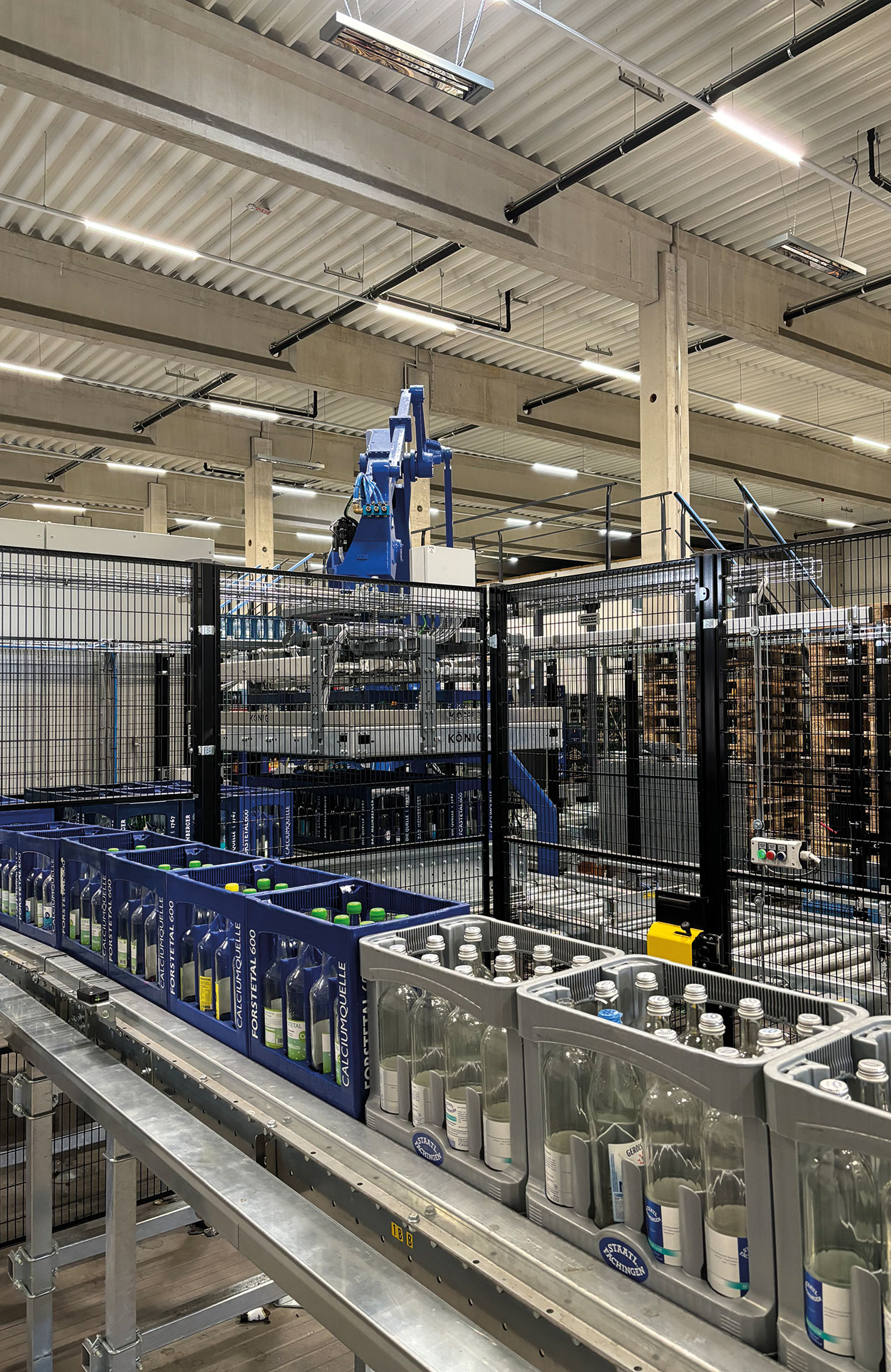 Zwei Roboter übernehmen die Depalettierung und Palettierung. Effizienz und Arbeitserleichterung sind auch hier Trumpf: Wenn die Leergutkisten auf gemischt beladenen Paletten in der Anlage ankommen, werden sie automatisch lagenweise vom Depalettierer entladen. Bis zu 2.800 Kästen pro Stunde schafft der Roboter.