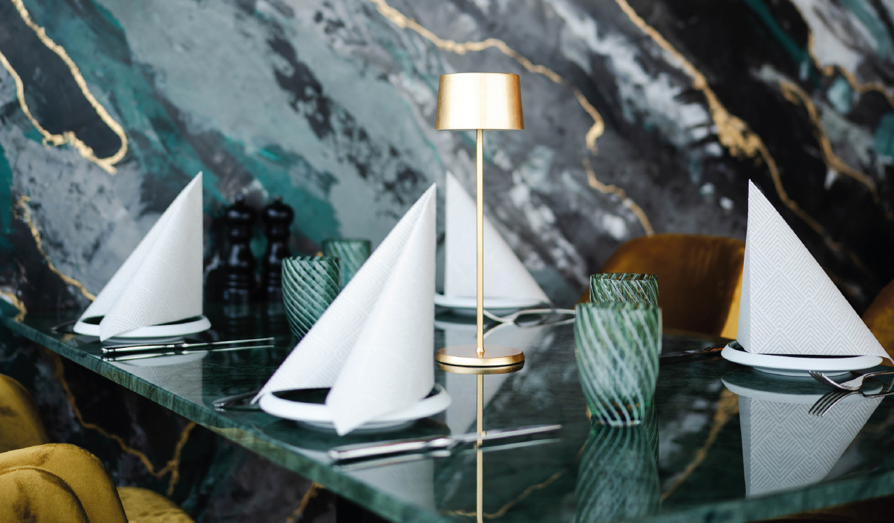 Die Einrichtung ist authentisch italienisch – und edel. Die vorherrschenden Farben sind grün, golden und anthrazit. Dazu passend sind die Wände in moderner venezianischer Staffeltechnik gestaltet, die das Licht reflektiert und einen marmorähnlichen Glanz erzeugt. Handgearbeitete Lampen aus Italien ergänzen den exklusiven Eindruck.