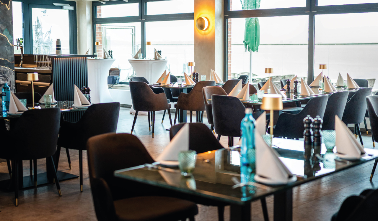 Bei einem Brand im Jahr 2018 war das imposante Restaurantgebäude am Strand der Kieler Förde stark beschädigt worden und stand seitdem leer. Donato Tripaldi und seine Partnerin gestalteten die Räume von Grund auf neu. Für Leonora Gashi, die ihre Ausbildung im Vorgängerbetrieb begann, ein Herzensprojekt: „Wir haben sehr viel Liebe in die Ausgestaltung der Räume und in die Erarbeitung der Speise- und Getränkekarte gesteckt. Nun ist ein Ort entstanden, an dem alles zusammenpasst.“