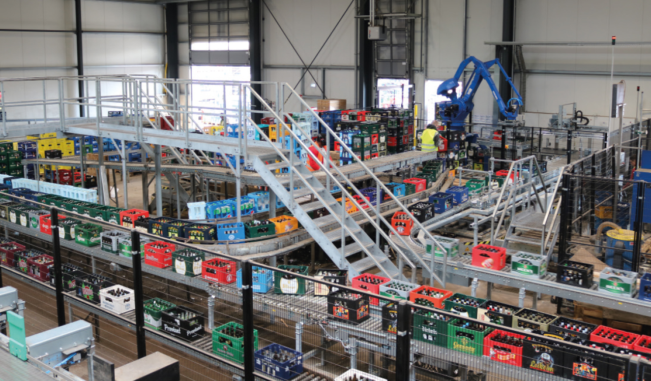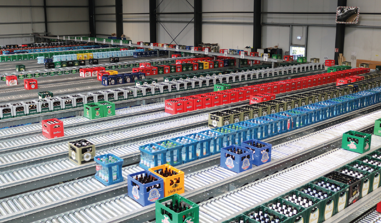 Die jetzt umgesetzte Erweiterung ist beträchtlich: Allein 24 neue Sortierbahnen sind während des Umbaus für eine noch effizientere Trennung der einzelnen Leergutartikel hinzukommen. Das Leergut verteilt sich in der Anlage nun auf über insgesamt 3,5 Kilometer langen Rollbahnen. Nimmt man die einzelnen Kastenstauregale hinzu, beläuft sich die Gesamtmenge der Bahnen sogar auf sechs Kilometer. Die modernisierte Anlage kann insgesamt zwölf Paletten Leergut gleichzeitig aufnehmen – sechs Paletten über die automatische Depalettierung und sechs weitere, die manuell durch die Mitarbeitenden auf die Förderbänder gegeben werden. Insgesamt konnte der gesamte Prozess der Leergutsortierung durch die Modernisierung deutlich beschleunigt werden: Mit der getätigten Investition konnte das automatische Sortiervolumen um über 25% erhöht werden, sodass am Standort in Erkelenz zukünftig bis zu 50.000 Kisten Leergut am Tag sortiert werden können.
