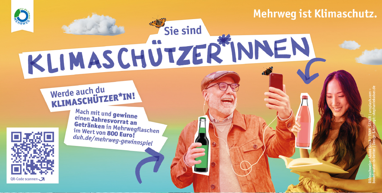 In Deutschland fallen fast zwei Millionen Einwegplastikflaschen als Müll an – stündlich! Eine höhere Mehrwegquote könnte die Abfallmenge drastisch reduzieren, und zudem noch reichlich schädliche Emissionen vermeiden. Allerdings liegt der Mehrweganteil bei den Getränkeflaschen in Deutschland gerade einmal bei 43 Prozent und damit deutlich unter den vom Verpackungsgesetz anvisierten 70 Prozent. Um das zu ändern, hat die Mehrweg-Allianz – bestehend aus dem Bundesverband des Deutschen Getränkefachgroßhandels, der Deutschen Umwelthilfe, der Stiftung Initiative Mehrweg, dem Verband des Deutschen Getränke-Einzelhandels, dem Verband Private Brauereien Deutschland und dem Verband Pro Mehrweg – ein Gewinnspiel in Leben gerufen. Noch bis Ende August verlosen die Organisatoren insgesamt 20 Jahresvorräte an Getränken in Mehrwegflaschen im Wert von 800 Euro. Alles, was die Teilnehmenden tun müssen ist, sich unter oben stehendem Link zu registrieren. Viel Erfolg!